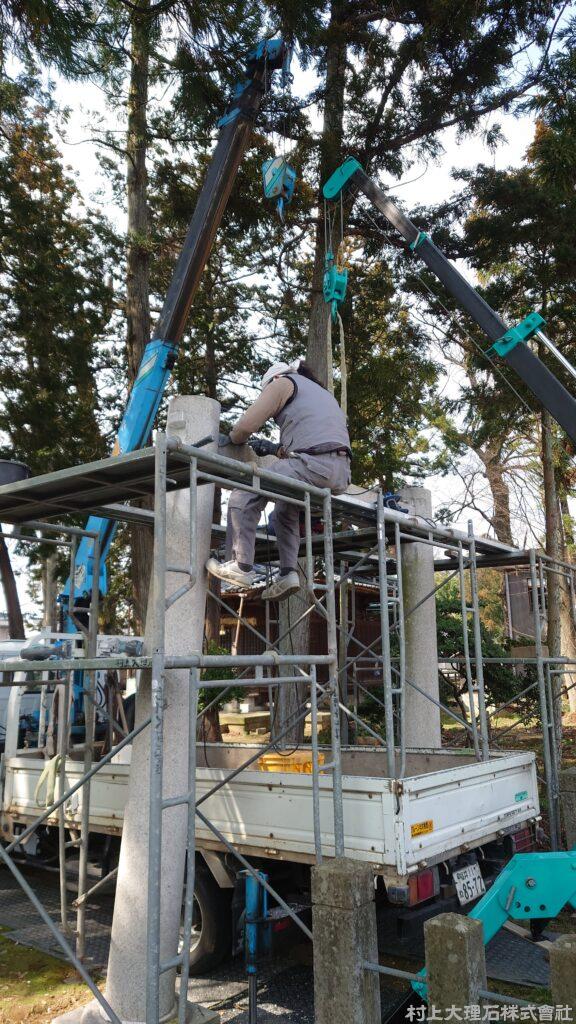 地震で竿石から竿石から倒れていたのですが、今後を考え、竿石の高さを半分にカットし、復旧しました。