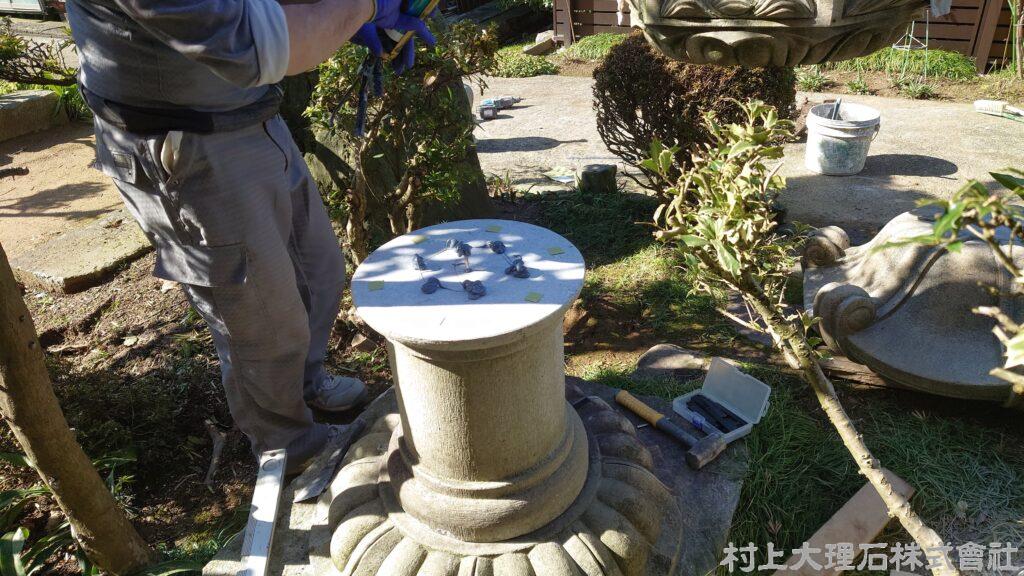 神前灯篭の片方が倒れたのですが、復旧。その際、ギボシの先端が欠けていたのを、ハギレ補修(新しい部品を接合)して直しています。